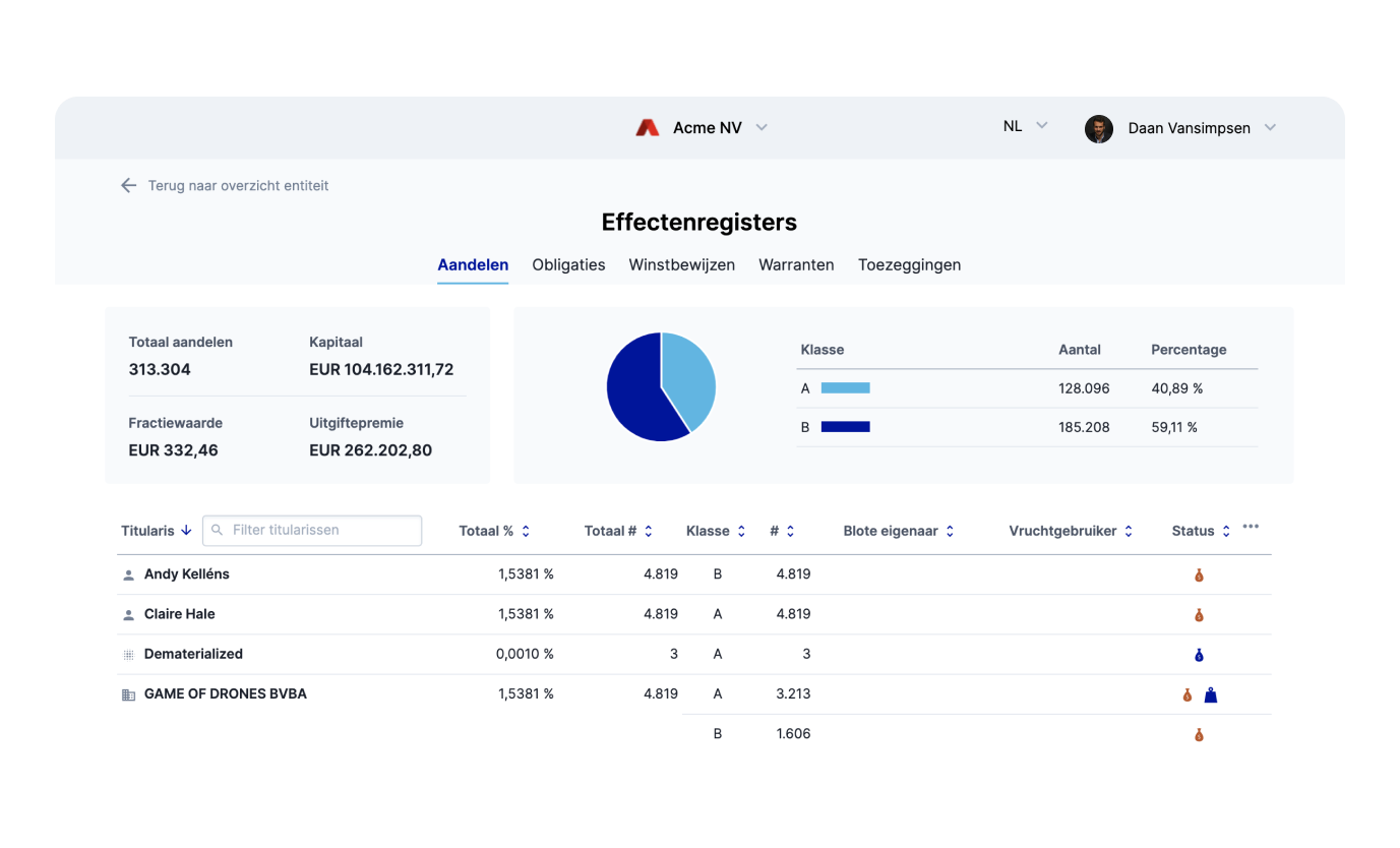 Digitaliseer jouw aandelenregister samen met kapitaalverhogingen, aandelenoverdrachten, dividend uitkeringen, enz. Maak dynamische organigrammen om uw groepsstructuur te visualiseren.
